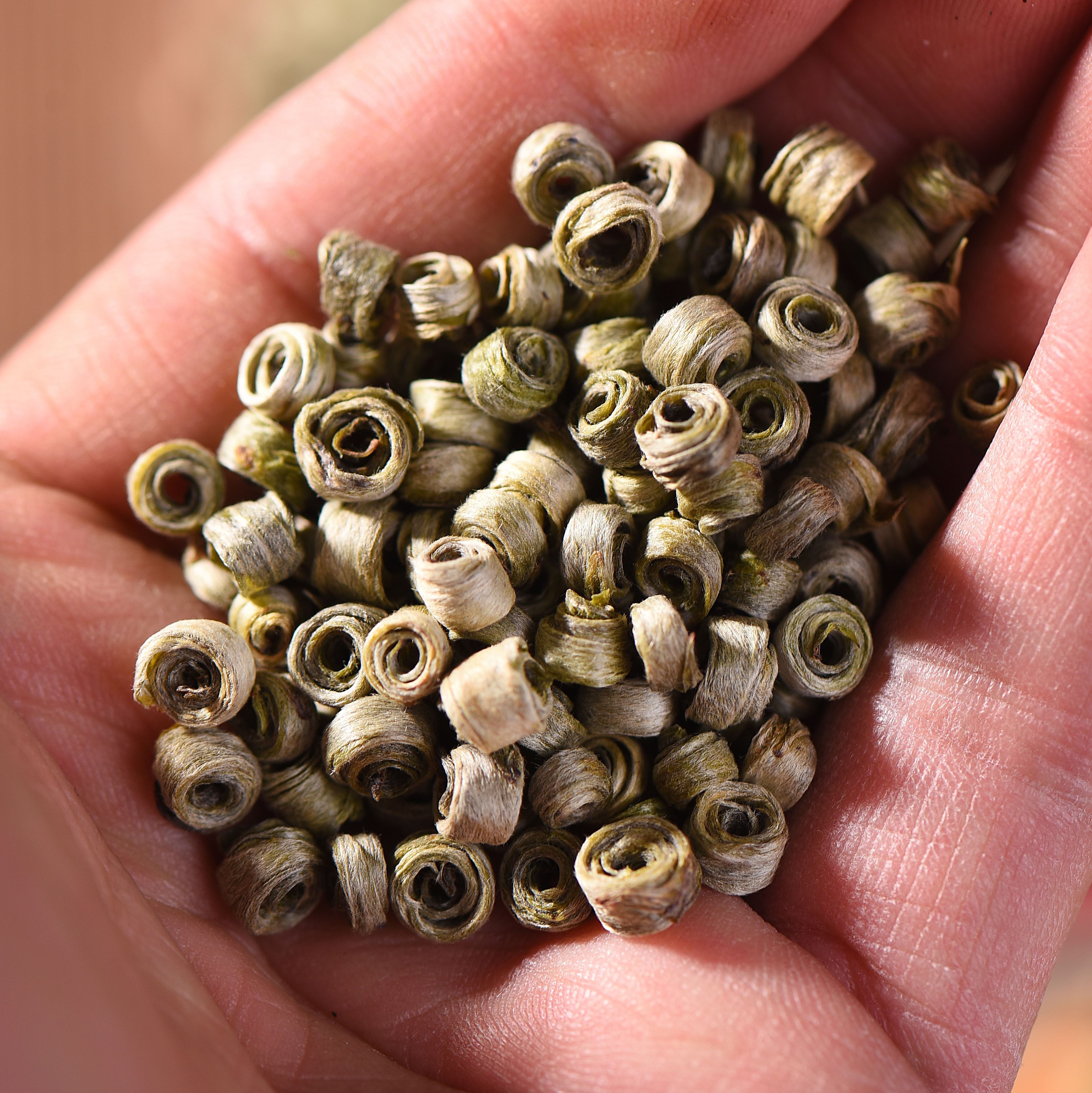 This premium white tea of Simao has been hand-rolled into perfectly symmetrical "earrings." When brewed, the ribbons sink to the bottom of the glass and slowly uncoil. This tea is especially fragrant, has a very pleasant mouth-feel and a strong cha qi that lasts throughout many infusions. The rolling of these Jade Earrings is an art form that requires a high level of skill and precision. It is a challenging and time-consuming process that yields spectacularly beautiful tea. Spring Harvest (early March)
